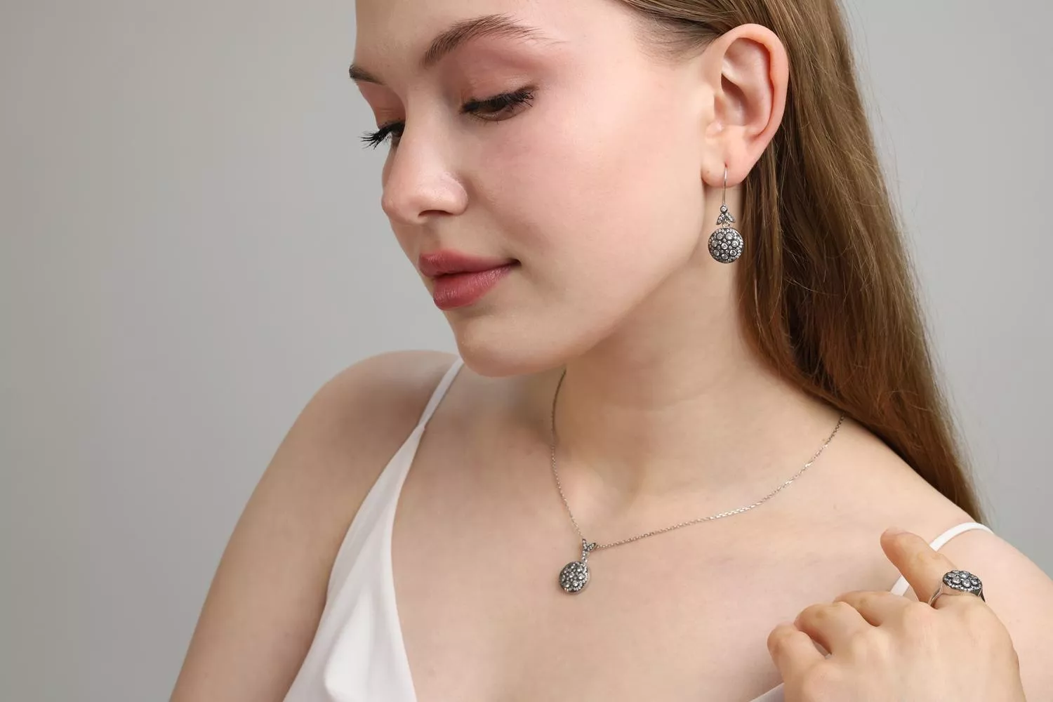 Geçmişin büyüsünü modern zarafetle harmanlayan bu özel tasarım set, nostaljik esintili detayları ve ince işçiliğiyle dikkat çekiyor. 925 ayar gümüşten üretilen kolye, küpe ve yüzük; aynı antika motifin uyum içinde işlendiği yapısıyla birbirini kusursuz şekilde tamamlıyor.