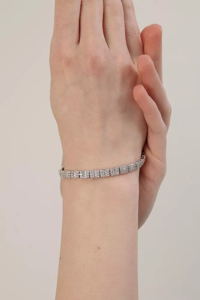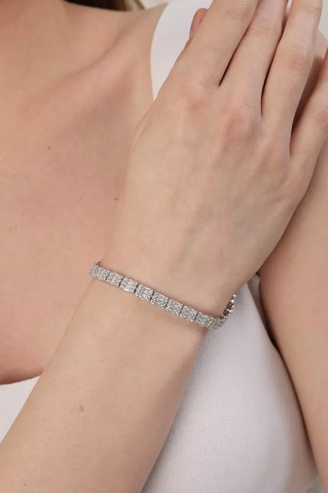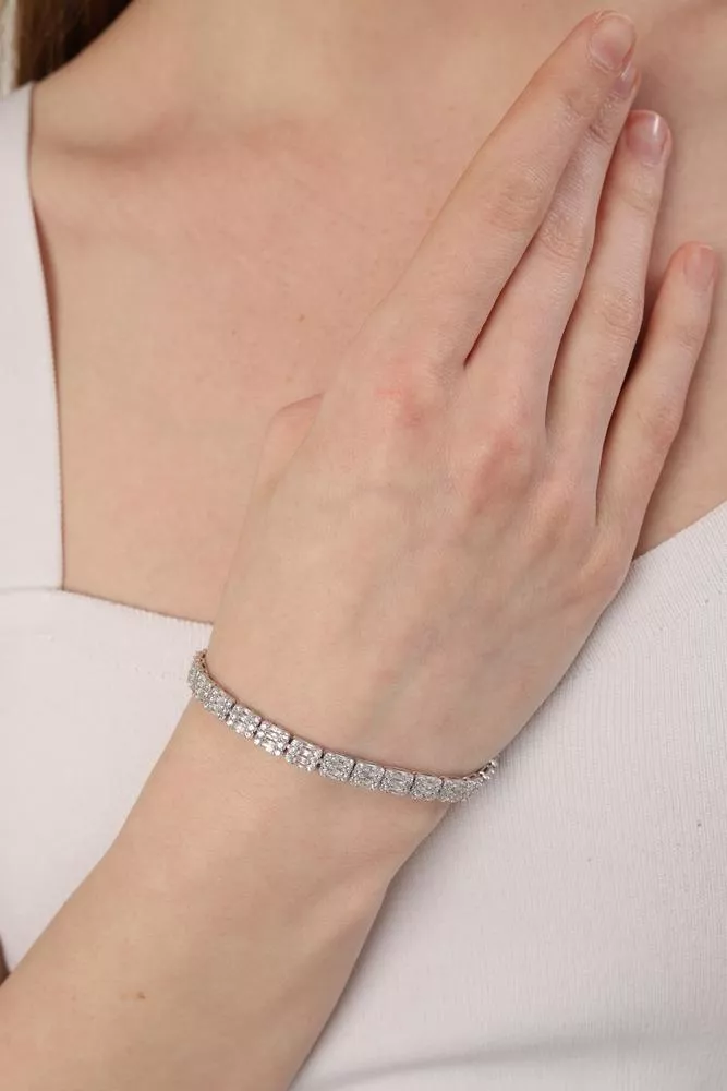 Zarif baget taş görünümlü kare formlu dizilimiyle, bu klasik tenis bileklik tüm bakışları bileğinizde toplar.