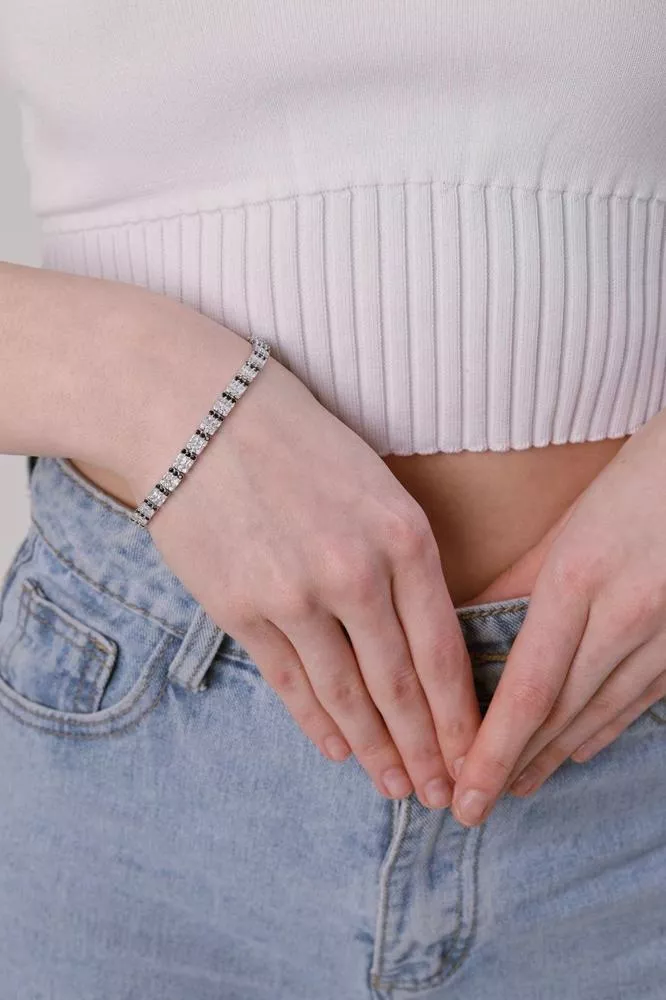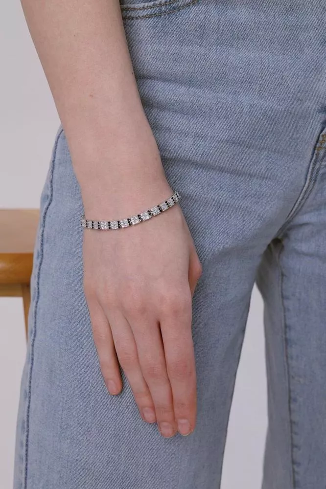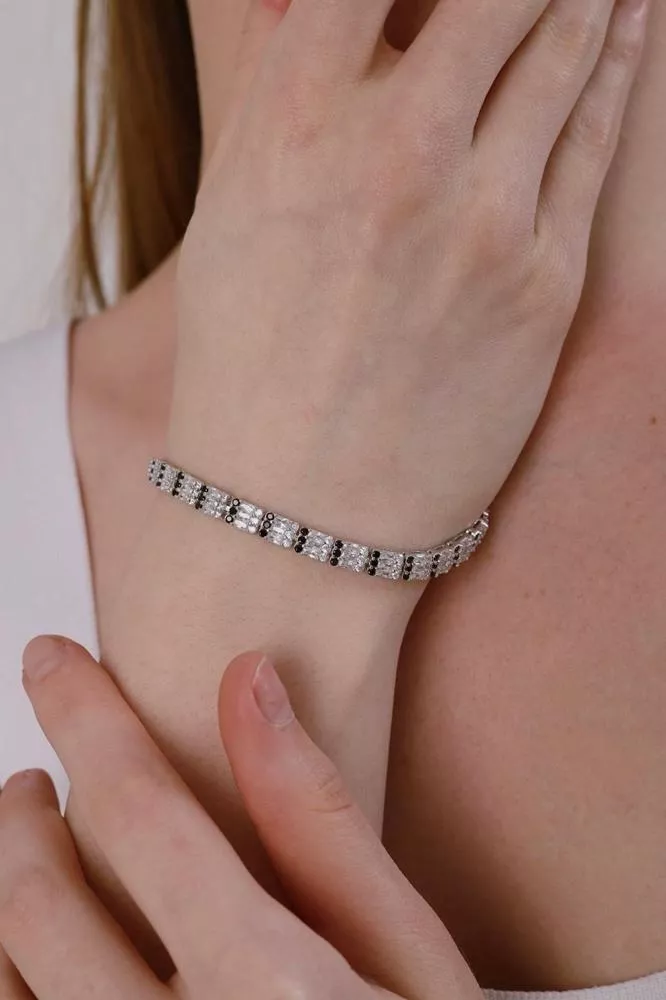 Zirkon taşların düzenli ve dikkat çekici dizilimiyle tasarlanan bu 925 ayar gümüş bileklik, klasik tenis modeli formuna baget kesim ışıltısını ekliyor. Hem günlük kullanımda zarif bir detay hem de özel günlerde stilinizi tamamlayan şık bir dokunuş sunar.