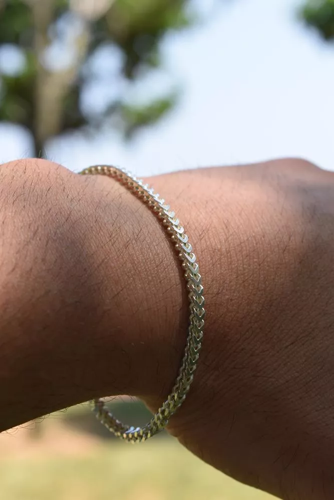 Zarif ve sade şıklığın simgesi: 925 ayar gümüşten üretilen Başak model bileklik, başak tanelerini andıran örgü formuyla klasik zincir tasarımlarına modern bir dokunuş katıyor. Hafif yapısı sayesinde gün boyu konforlu kullanım sunar. Minimal tarzı benimseyen erkekler için ideal bir tamamlayıcıdır.
