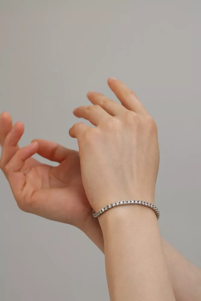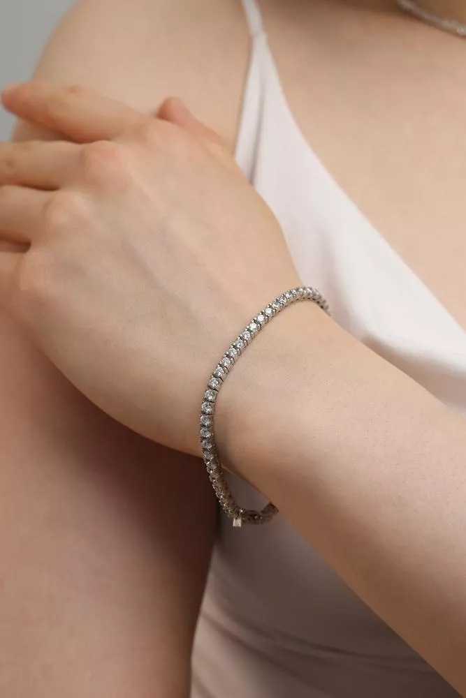 925 ayar gümüş üzerine tek tek yerleştirilmiş parıltılı taşlarla tasarlanan bu bileklik, ince yapısıyla bileğinizde zarif bir ışıltı bırakır. Hem günlük kullanımda sade bir şıklık, hem de özel davetlerde sofistike bir tamamlayıcı arayanlar için mükemmel bir seçim.