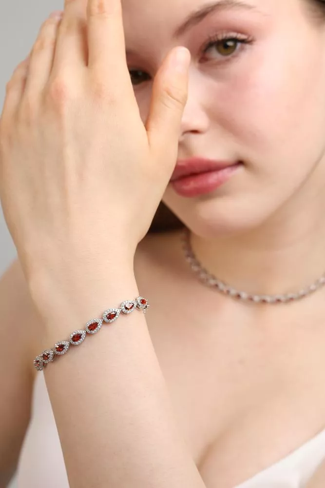Tutkulu kırmızı ve zarif beyazın kusursuz birlikteliği... Damla kesim taş detaylarıyla işlenmiş bu 3’lü set; kolye, bileklik ve küpe uyumuyla hem romantik hem de asil bir duruş sergiliyor