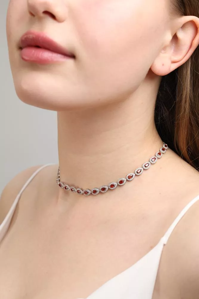 Damla kesim kırmızı taşlı 925 ayar gümüş kolye