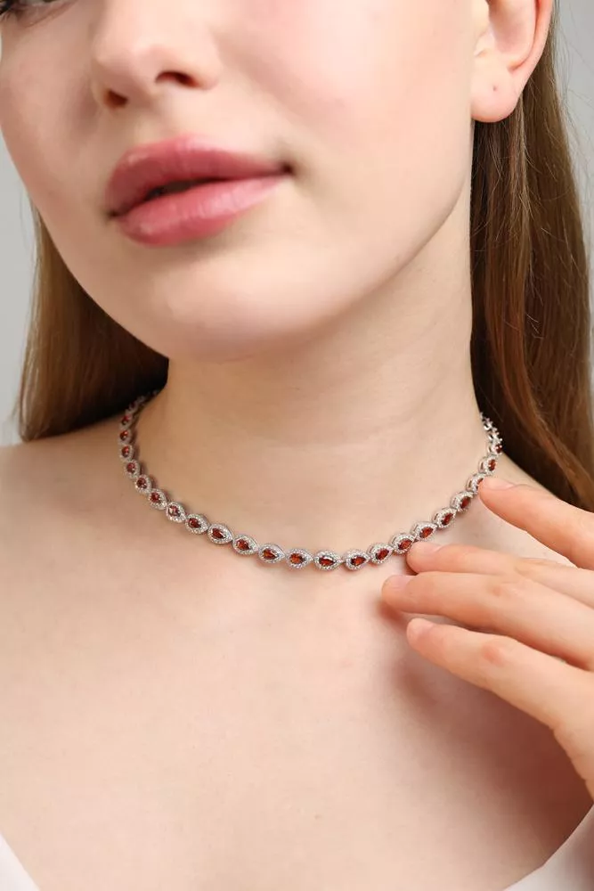 Zarif damla kesim kırmızı taşlar, ışıltılı zirkonlarla çerçevelenerek boynunuzda göz alıcı bir iz bırakır.