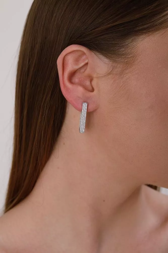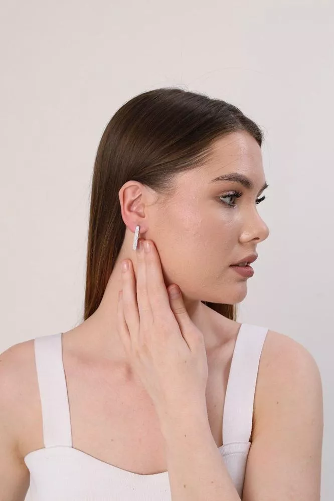 Modern ve minimal formuyla öne çıkan bu 925 ayar gümüş küpe, taşlı yüzeyiyle sade şıklığı ışıkla buluşturuyor. Hem gündelik kombinlere zarafet katmak hem de özel günlerde fark yaratmak için ideal bir seçim.