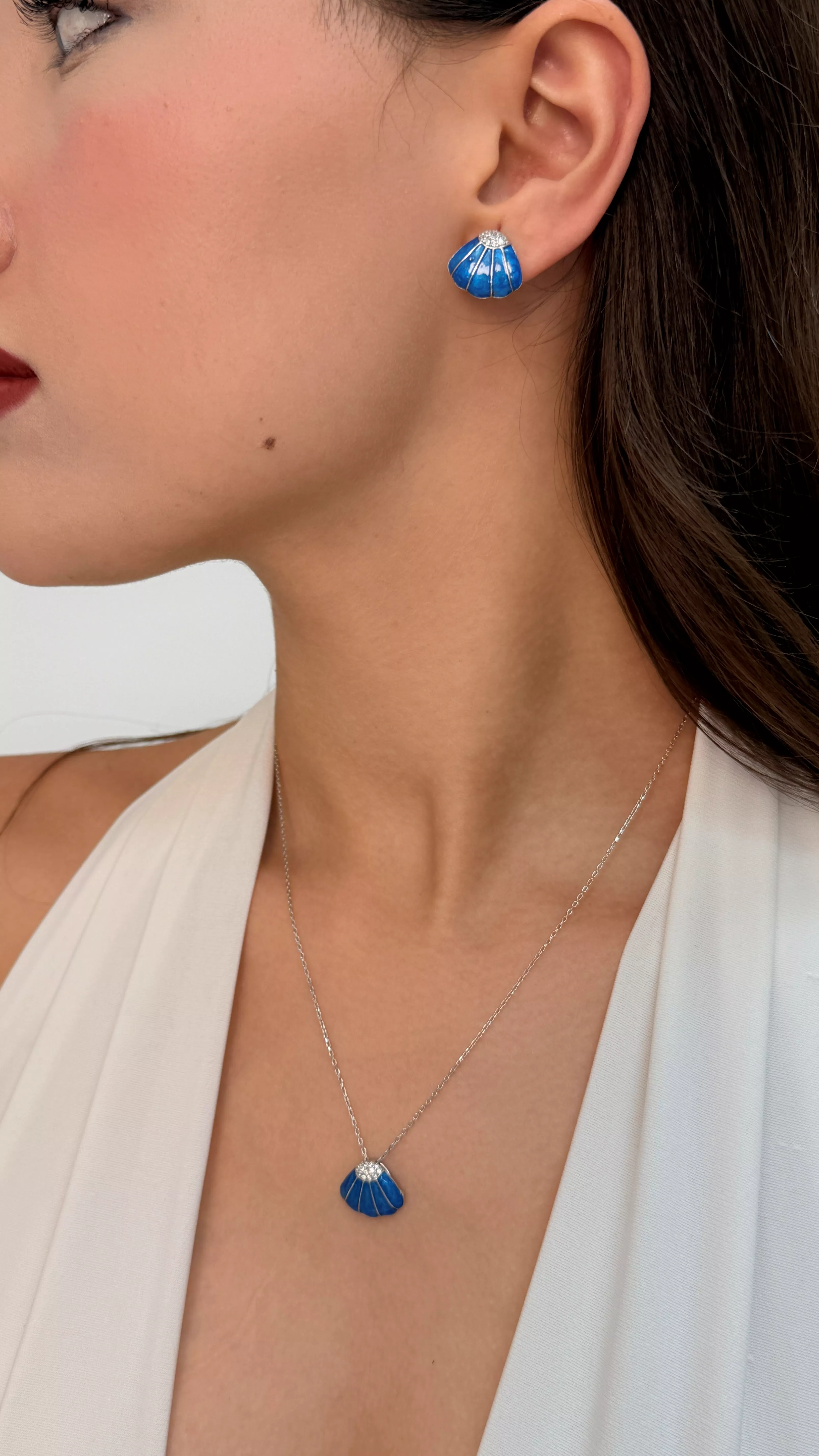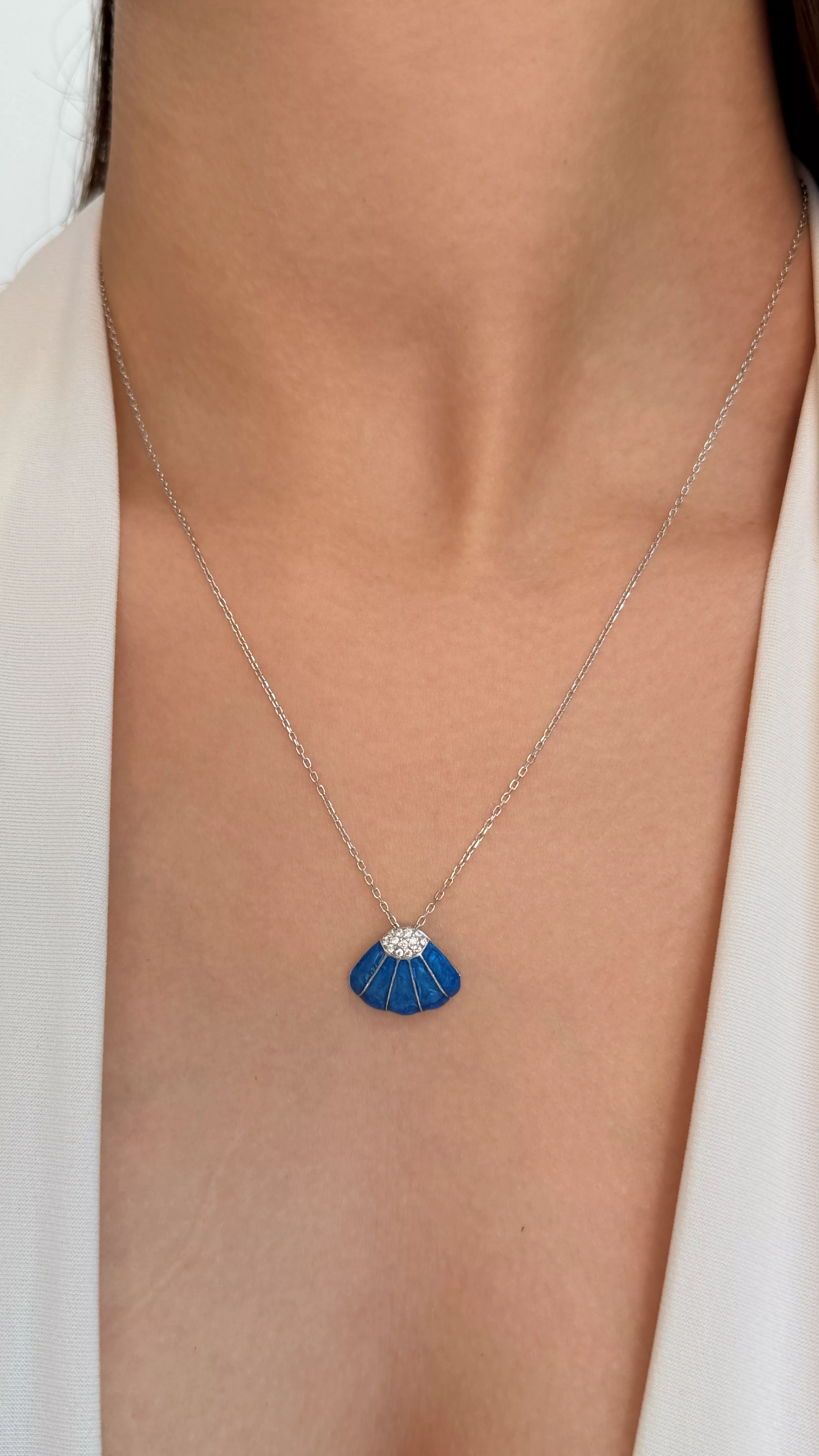 Denizin dinginliği ve yazın ferahlığı bu özel tasarım kolyede buluşuyor. 925 ayar gümüşten üretilen deniz kabuğu formundaki kolye ucu, canlı mavi mine kaplaması ve zarif zirkon taş detaylarıyla ışıldıyor. İnce zinciriyle boynunuza zarifçe yerleşen bu kolye, sade ama etkileyici bir şıklık sunar.