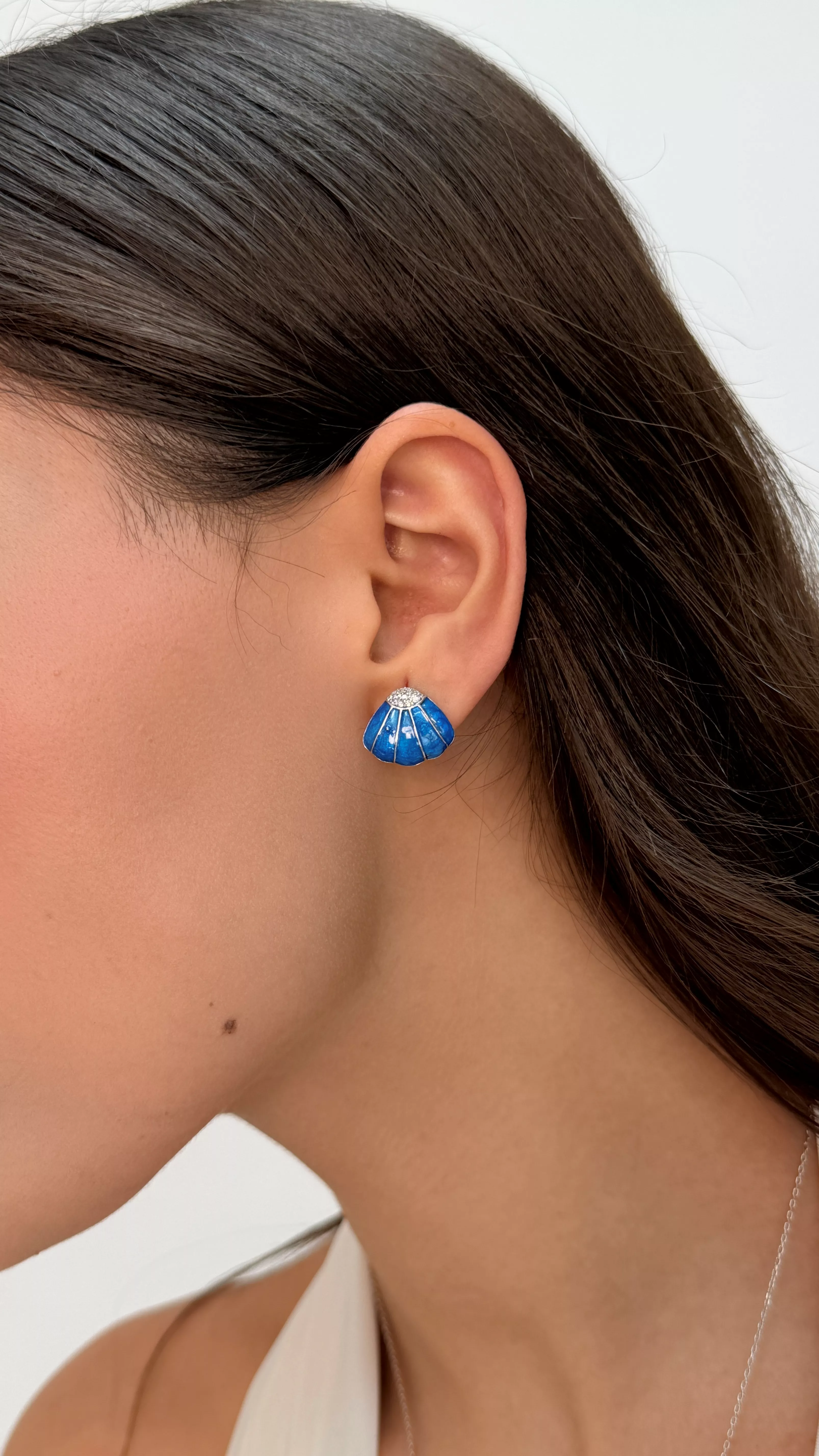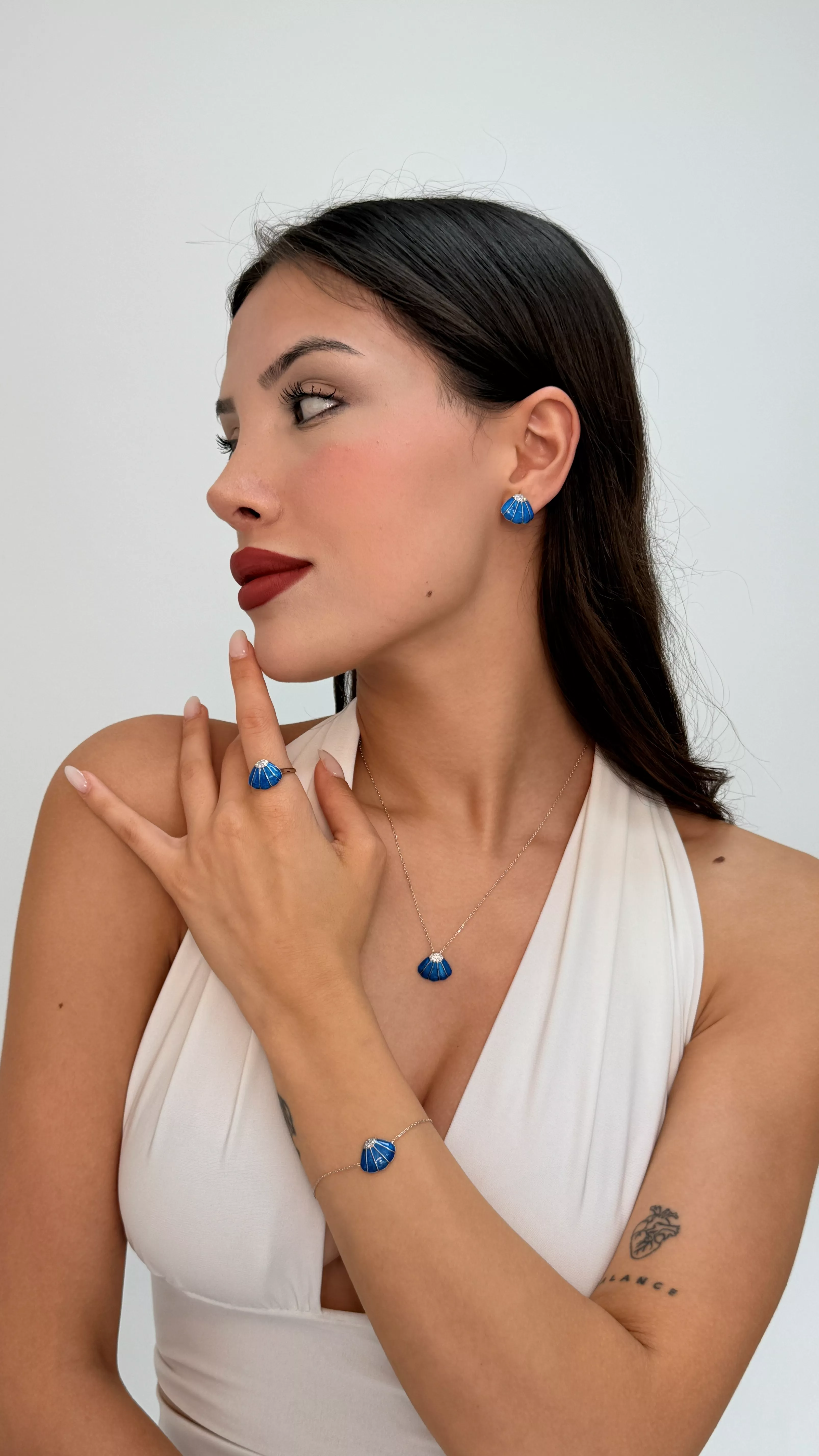 Doğadan ilham alan tasarımıyla öne çıkan bu deniz kabuğu formundaki küpe, 925 ayar gümüş üzerine canlı mavi mine işçiliğiyle hayat buldu. Küpenin üst kısmında yer alan zarif zirkon taş detayı, deniz kabuğunun doğal güzelliğine parıltılı bir dokunuş katıyor.