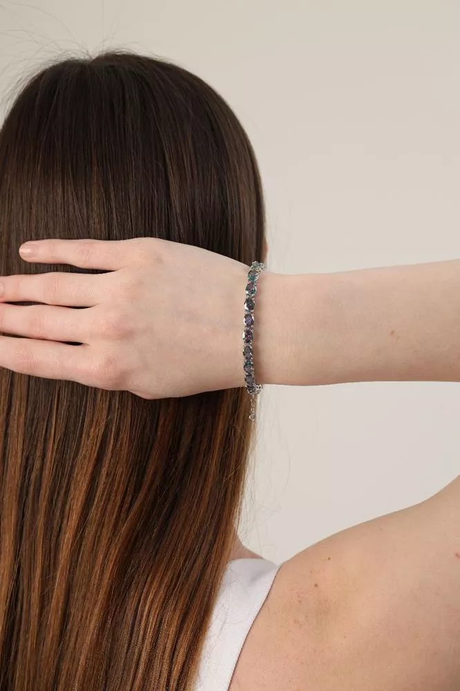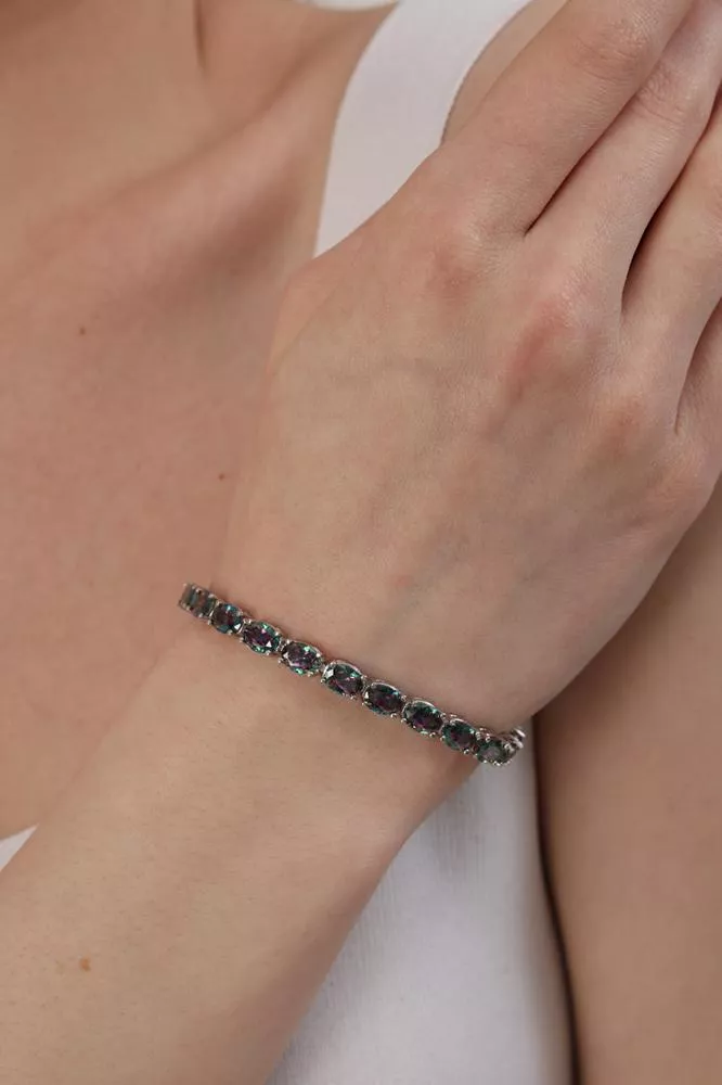 Işığa göre renk değiştiren mistik topaz taşlarla süslenmiş bu 925 ayar gümüş su yolu bileklik, zarafeti ve gizemi bir arada sunar. Göz alıcı ışıltısı ve klasik su yolu formuyla, hem günlük stilinizi tamamlar hem de özel anlarınızı taçlandırır.