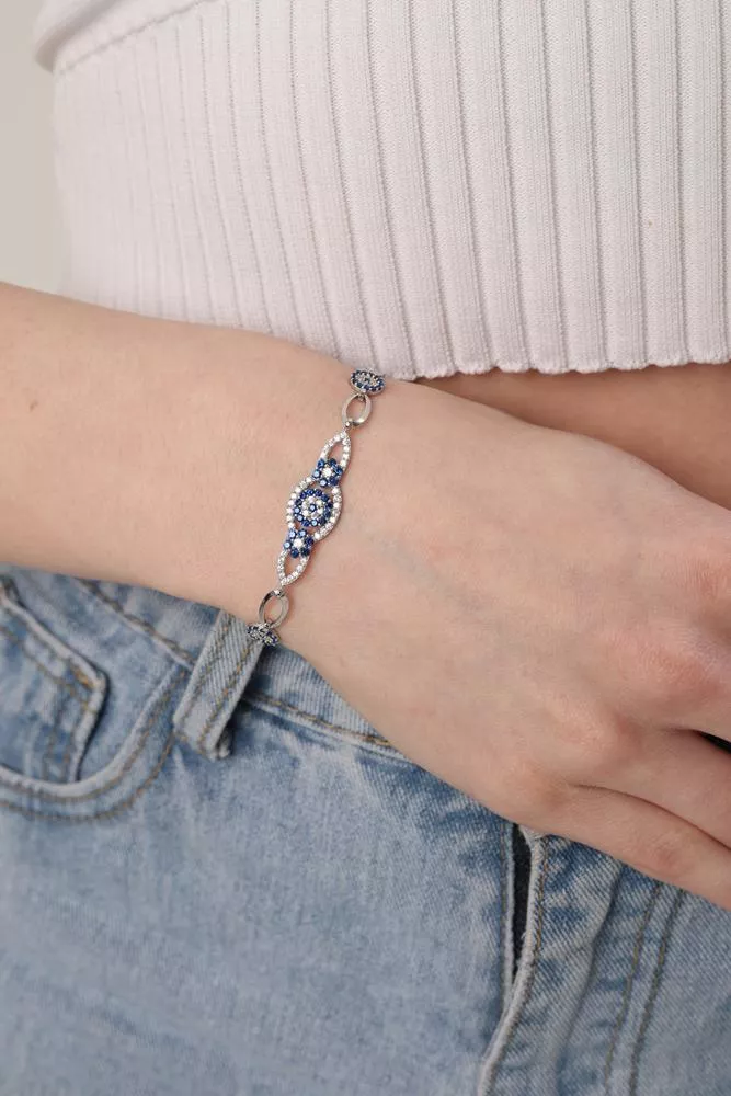 Göz alıcı mavi ve beyaz taşların ışıltısıyla tasarlanan Nazar Yolu Bileklik, merkezdeki göz motifiyle şıklığın ve anlamın buluştuğu özel bir tasarımdır.