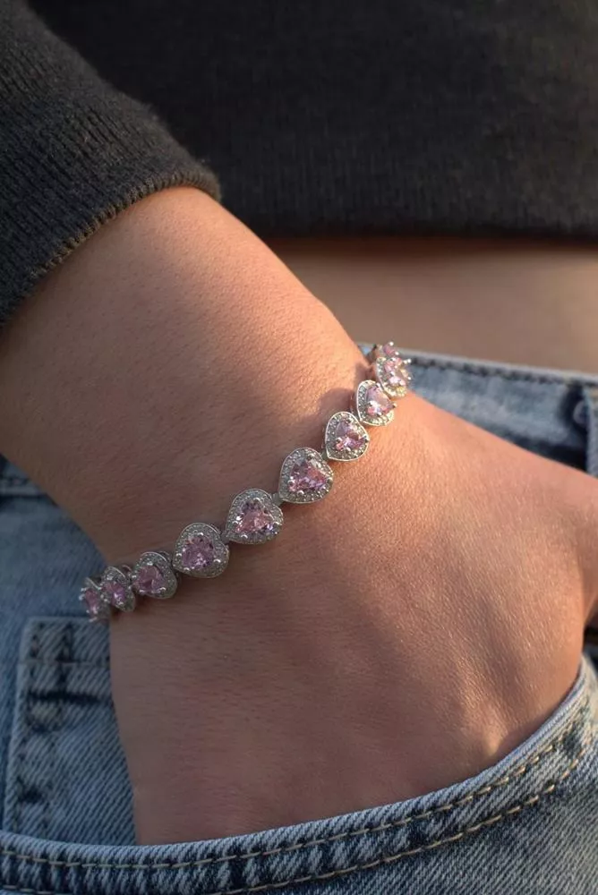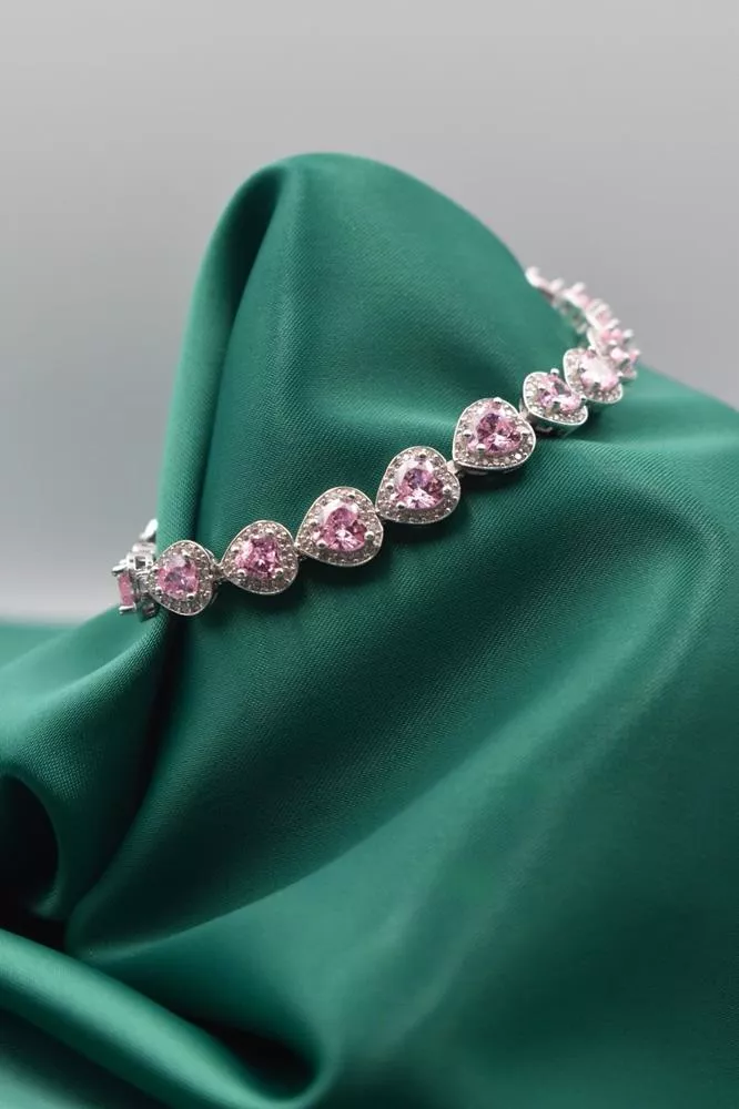 Kalbin en özel yansıması, pembe taşların romantik ışıltısıyla bu bileklikte hayat buluyor. Gümüşün zamansız asaletine eşlik eden kalp detayları, sevginin ve şıklığın kusursuz bir ifadesi.