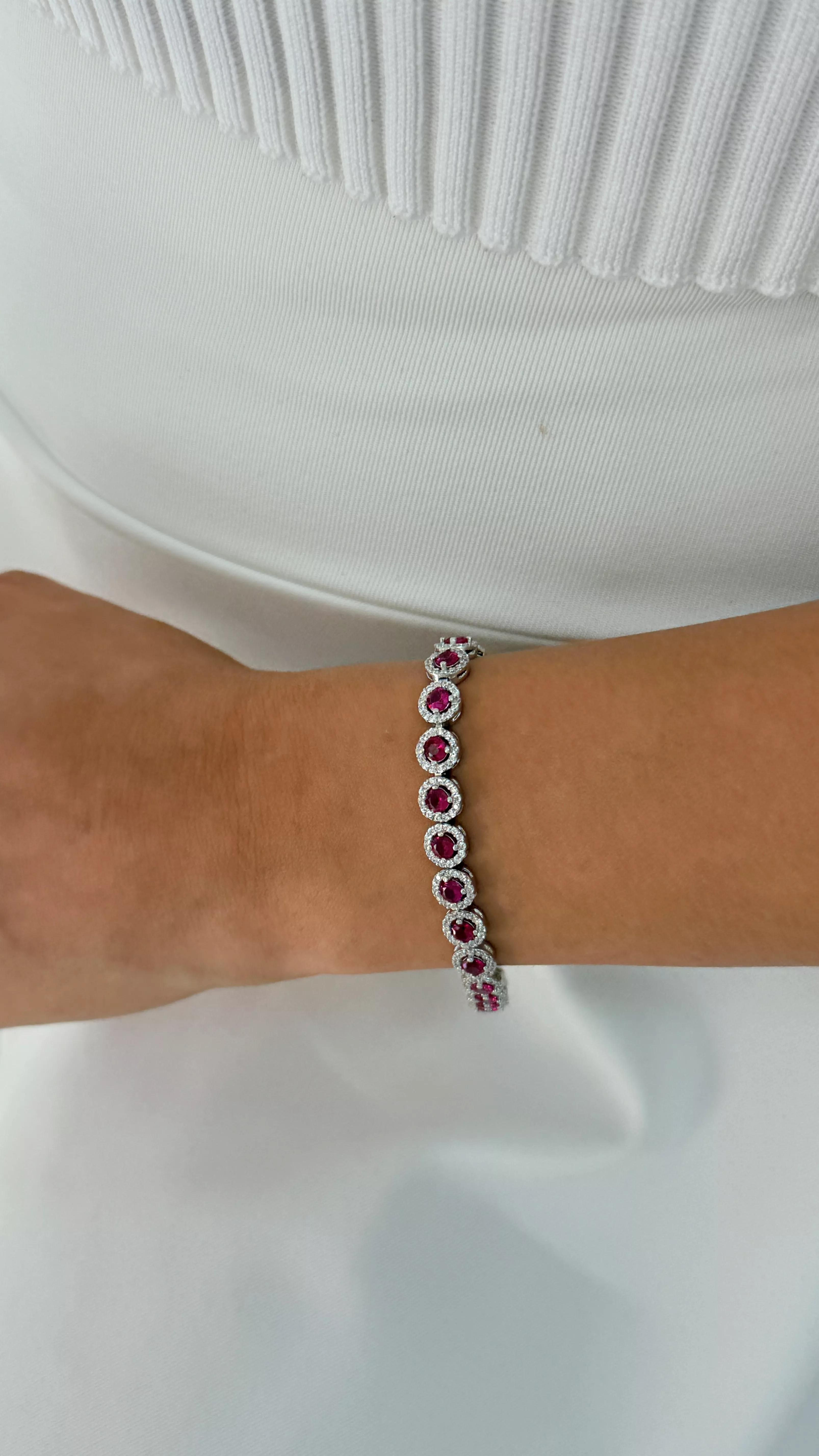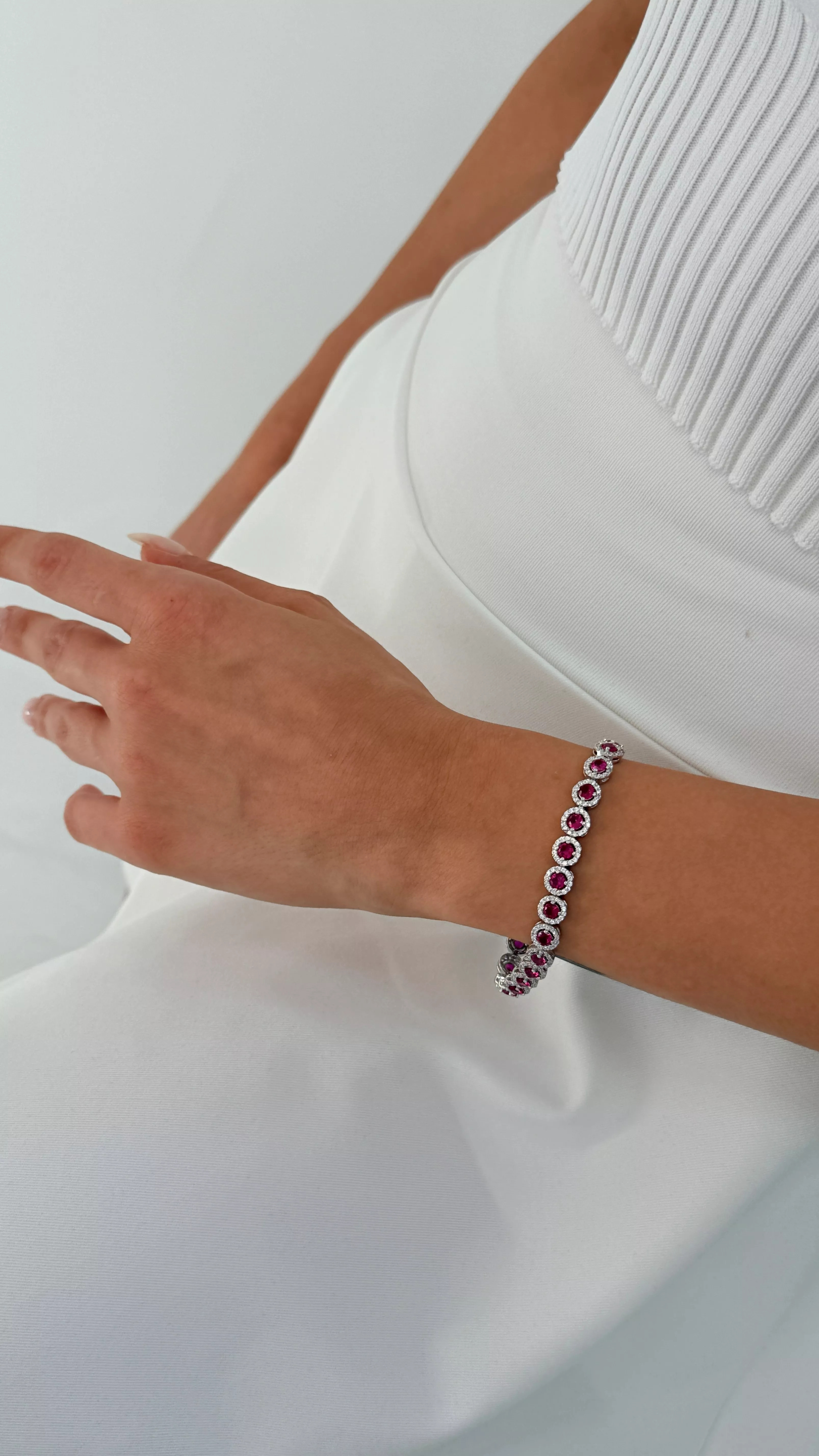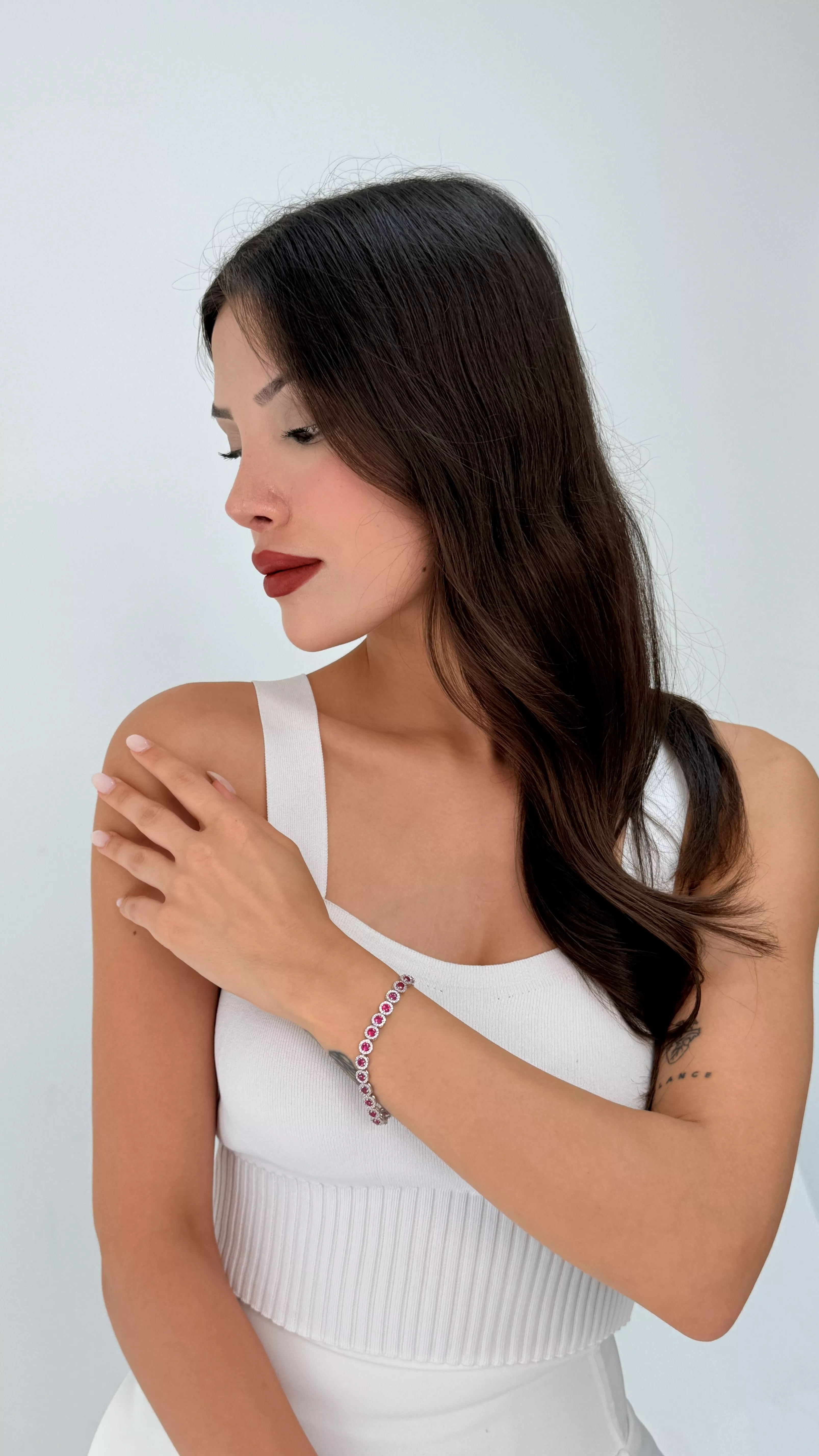 Kadınsılığın ve zarafetin sembolü pembe taşlarla tasarlanan bu su yolu bileklik, 925 ayar gümüş üzerine özenle işlenmiştir. Oval kesimli taşlar, bilek boyunca su gibi akarak zarif bir ışıltı sunar. Her bir taşın canlı tonu, bilek hareketiyle ışığı yakalayarak büyüleyici bir etki yaratır.