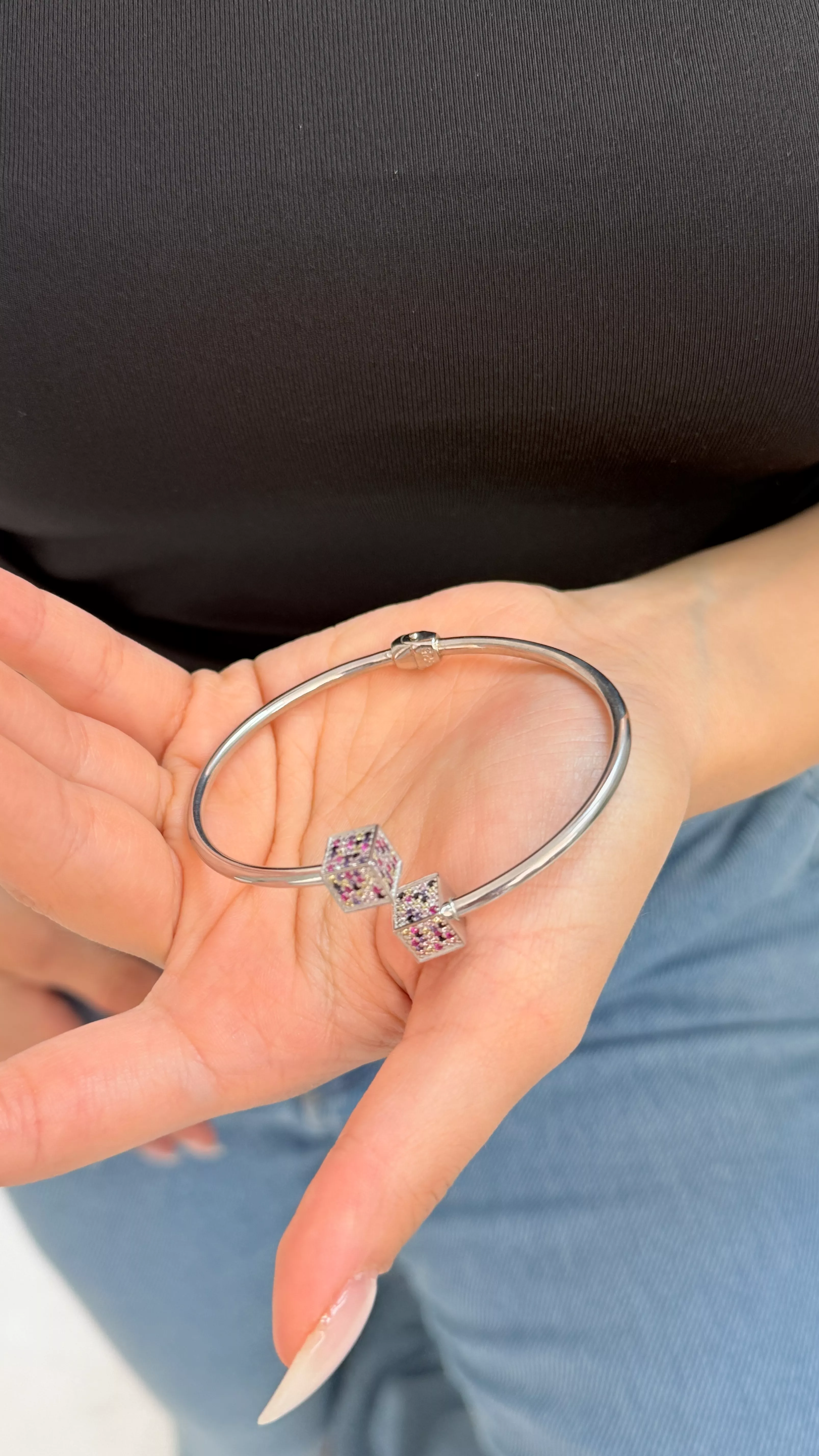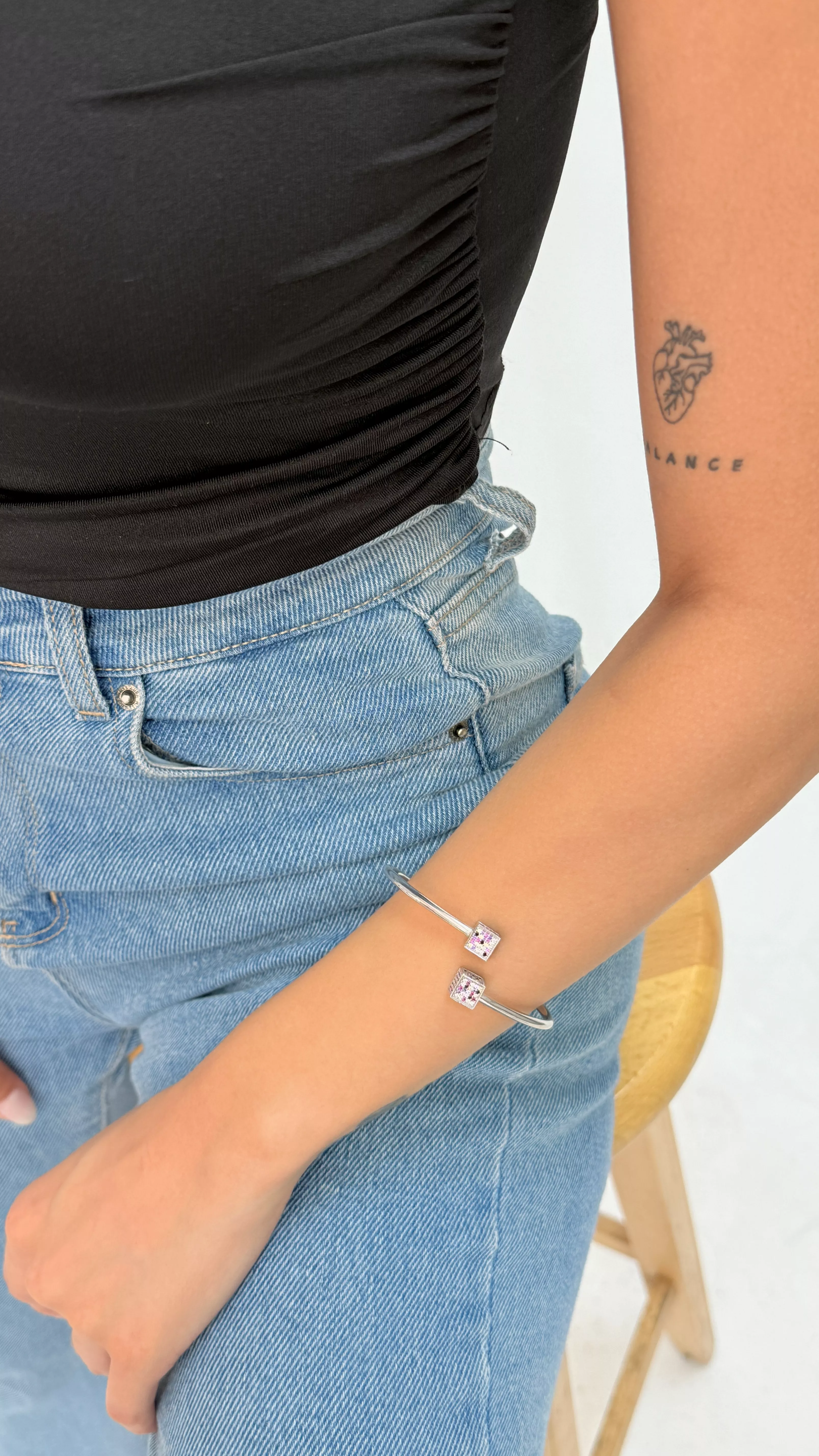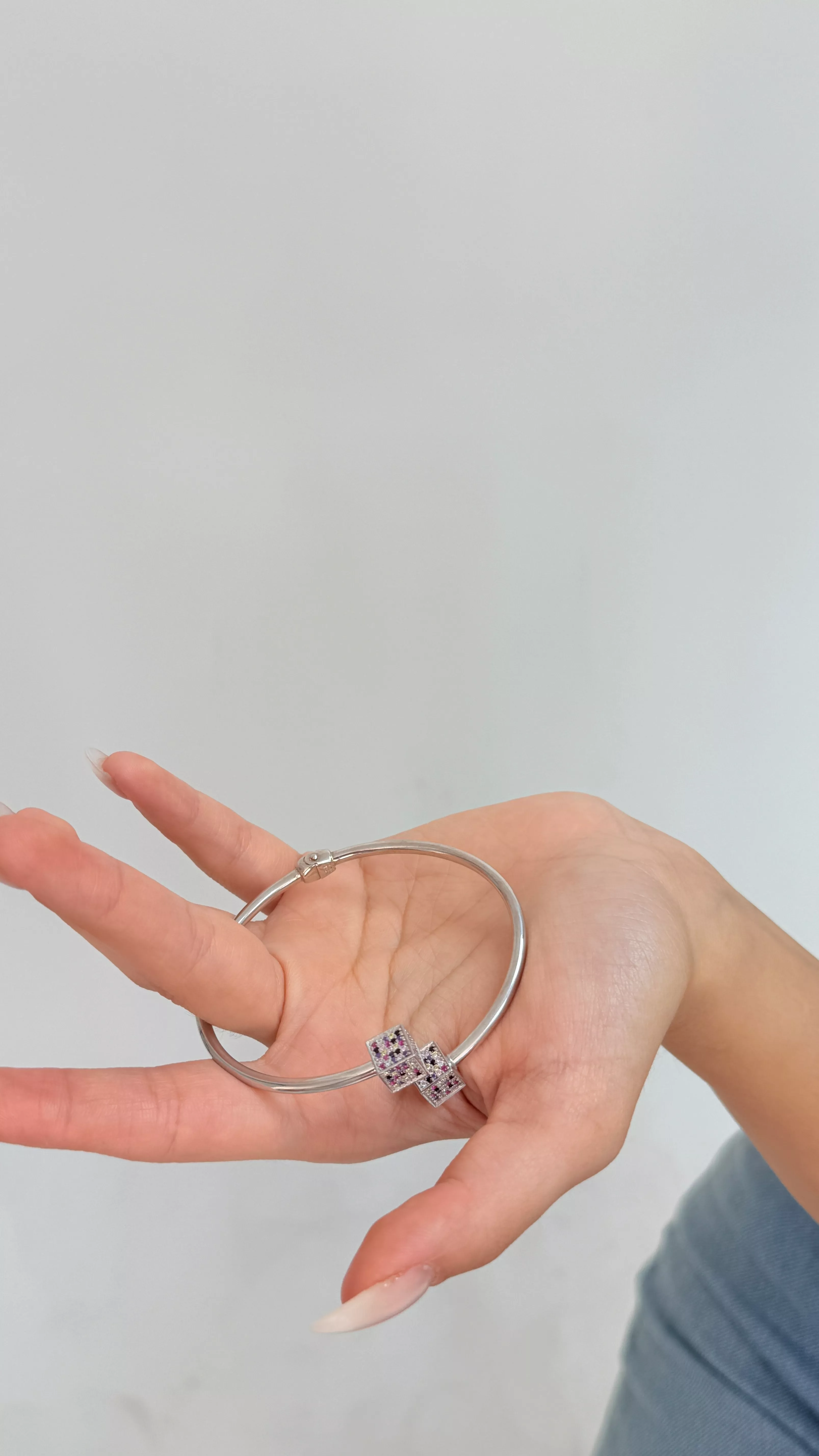 925 ayar gümüşten üretilen bu modern kelepçe bileklik, zarif ve canlı renklerde taşlarla süslenmiş küp motifleriyle dikkat çeker. Geometrik formun netliği ile renkli taşların enerjisi bir araya gelerek sade ama iddialı bir şıklık yaratır.