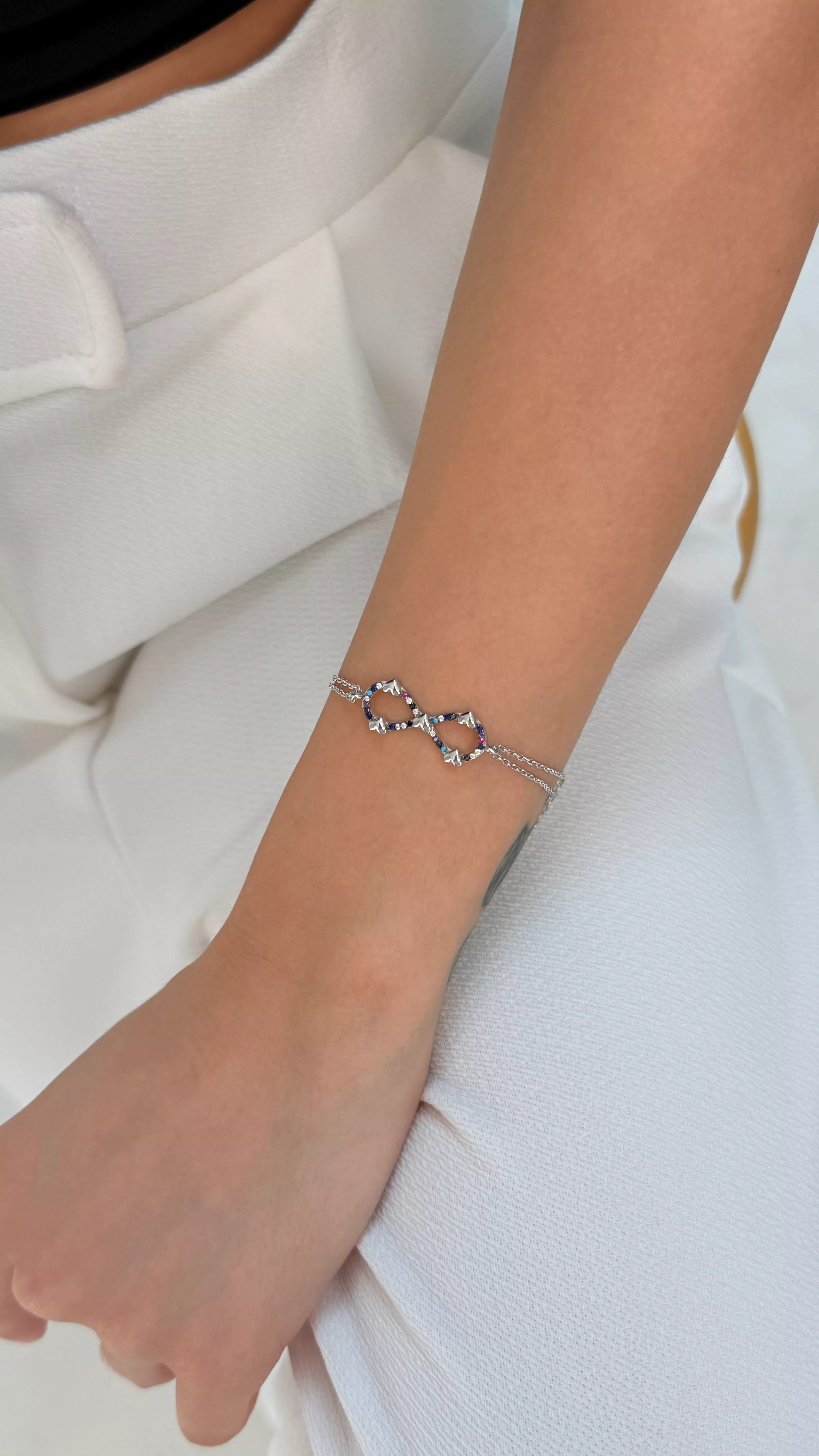 925 ayar gümüşten üretilen bu özel bileklik, kalp ve sonsuzluk sembollerini renkli taşlarla bir araya getirerek hem anlamlı hem göz alıcı bir tasarım sunar. Kalp; sevgiyi ve bağlılığı simgelerken, sonsuzluk işaretiyle birleşerek duyguların sürekliliğini vurgular.