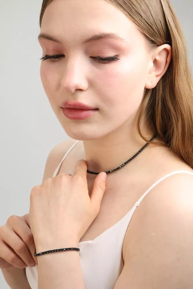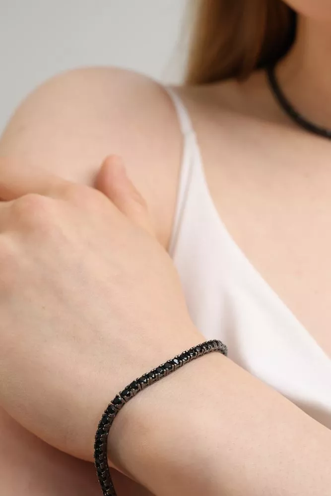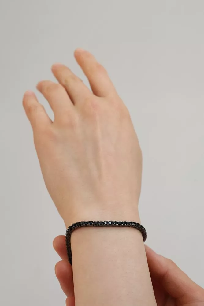 925 ayar gümüş üzerine özenle yerleştirilmiş siyah zirkon taşlarla tasarlanan bu bileklik, sade çizgileriyle güçlü bir duruş sergiler. Günlük kombinlerde iddialı bir detay olarak parladığı gibi, gece şıklığına da asil bir dokunuş katar.