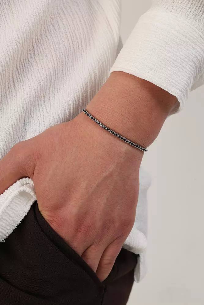 Siyah zirkon taşların ince zincir üzerinde su yolu formunda dizildiği bu bileklik, sade bir şıklık ve güçlü bir duruş sunar.