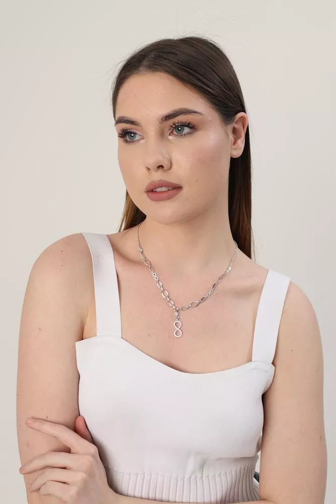Zarif halkalı zincir detayları ve ışıltılı taşlarla süslenmiş sonsuzluk sembolüyle tamamlanan bu kolye, hem şıklığı hem de anlamı bir arada sunar. Sonsuz sevgi, sadakat ve bağlılığın sembolü olan bu özel tasarım; hem kendinize hem sevdiklerinize özel bir armağan niteliğindedir. Gündelik kombinlerden özel davetlere kadar her anınıza uyum sağlar.