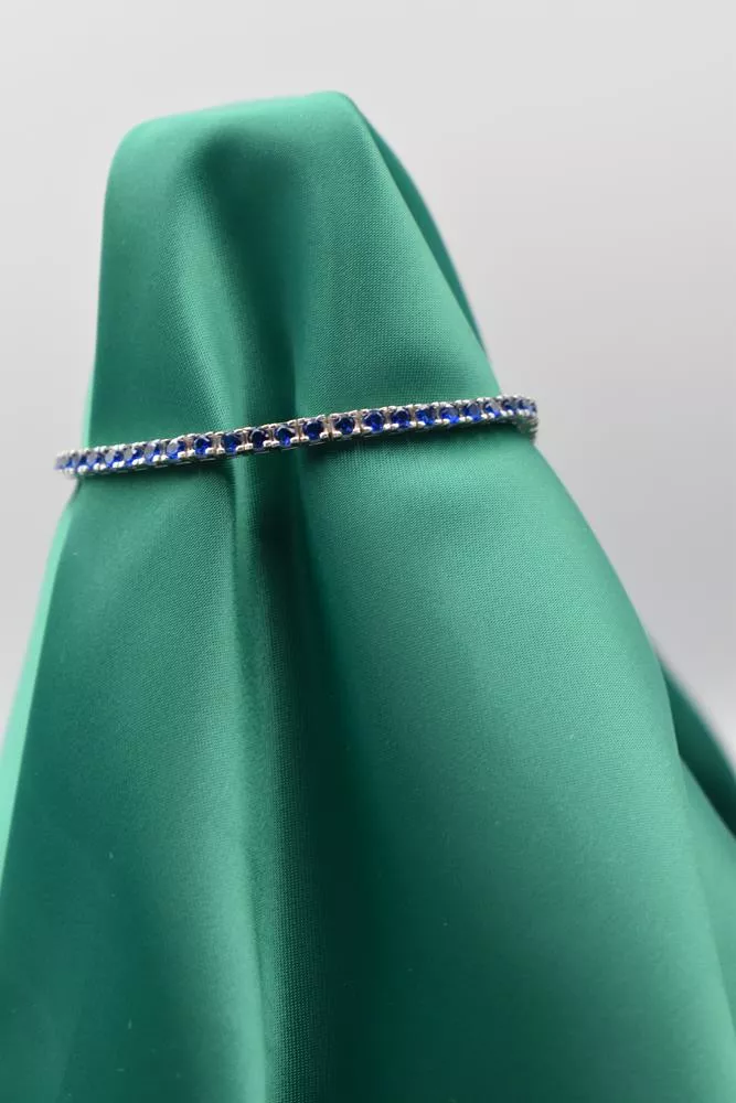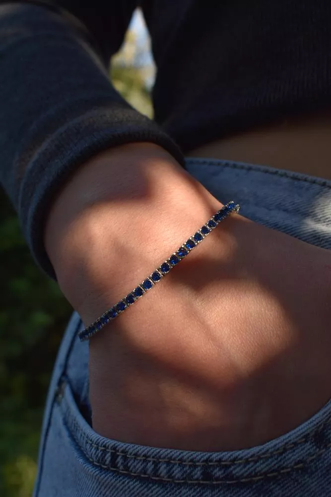 Zamansız şıklığın saf hali… Derin mavinin büyüsüyle işlenmiş, sentetik safir taşları ışığı her açıdan yakalayarak bileğinize eşsiz bir ışıltı katıyor