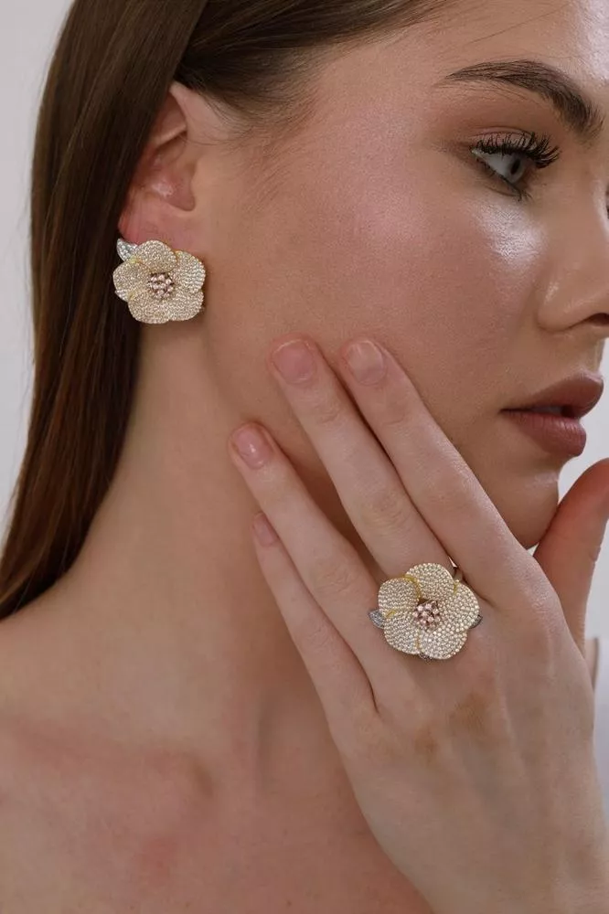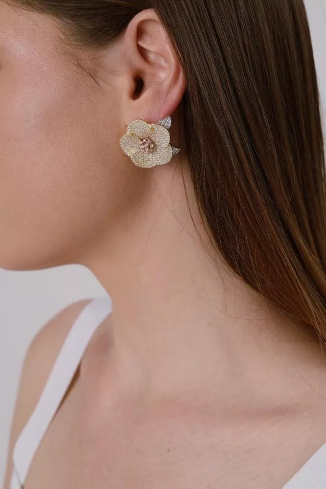 925 ayar gümüşten üretilen bu zarif küpe, gül formundaki tasarımıyla romantizmi ve şıklığı bir araya getiriyor. Beyaz, sarı ve roze altın tonlarında kaplanmış yüzeyi, parıltılı taşlarla buluşarak göz alıcı bir ışıltı sunar. Hem klasik hem modern stilin tamamlayıcısı olan bu küpe, özel günler ve davetler için ideal bir tercih.