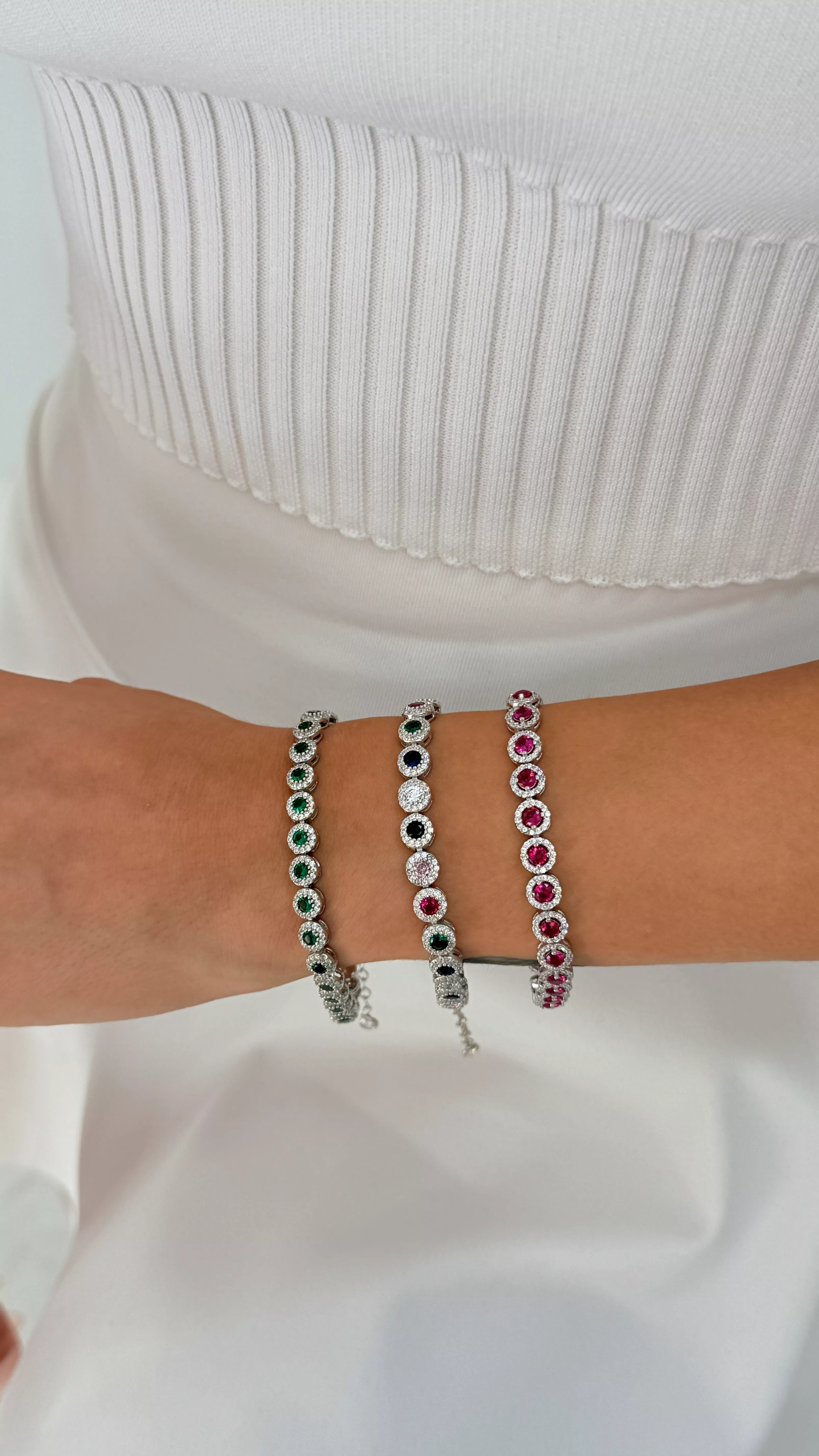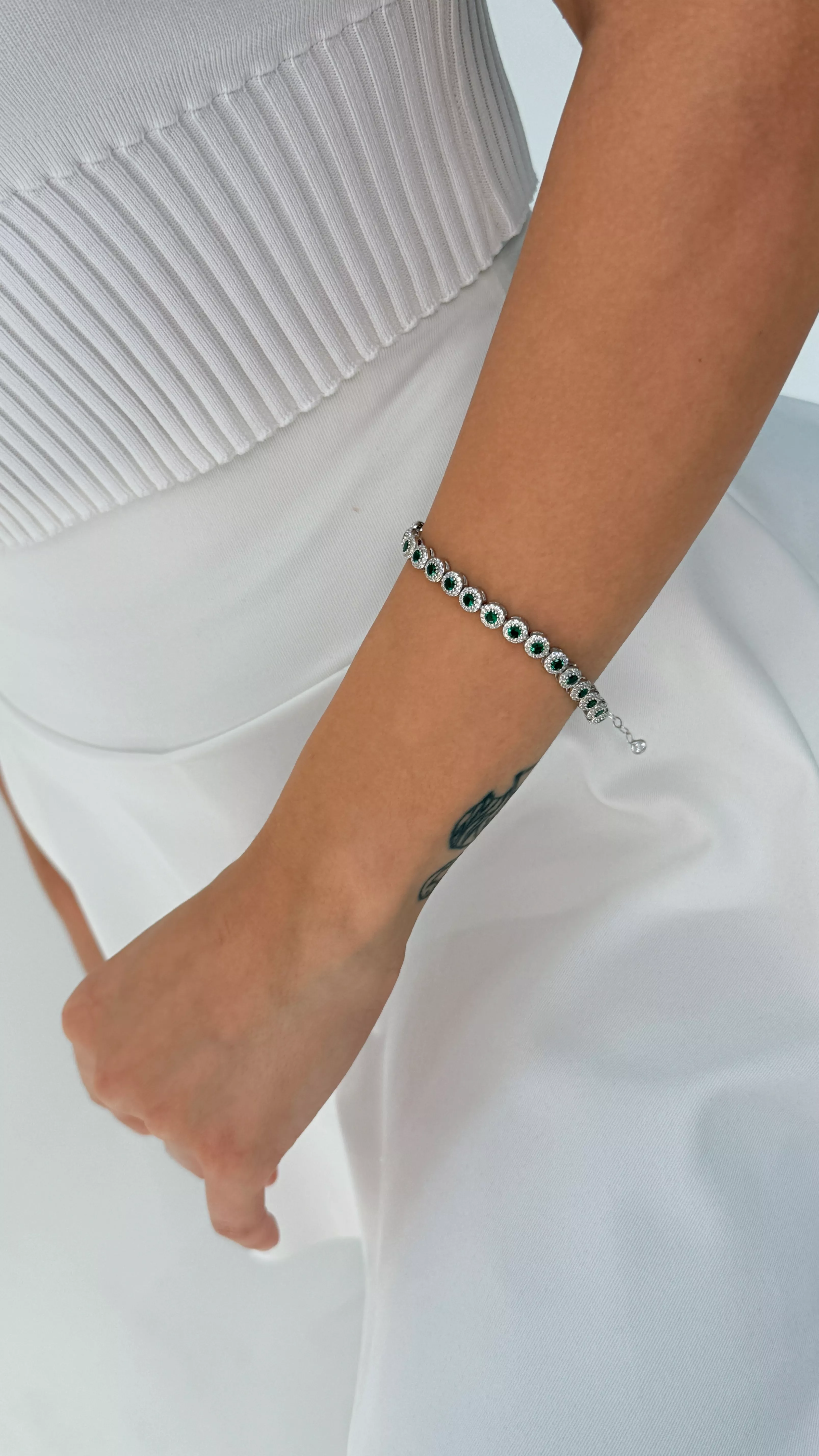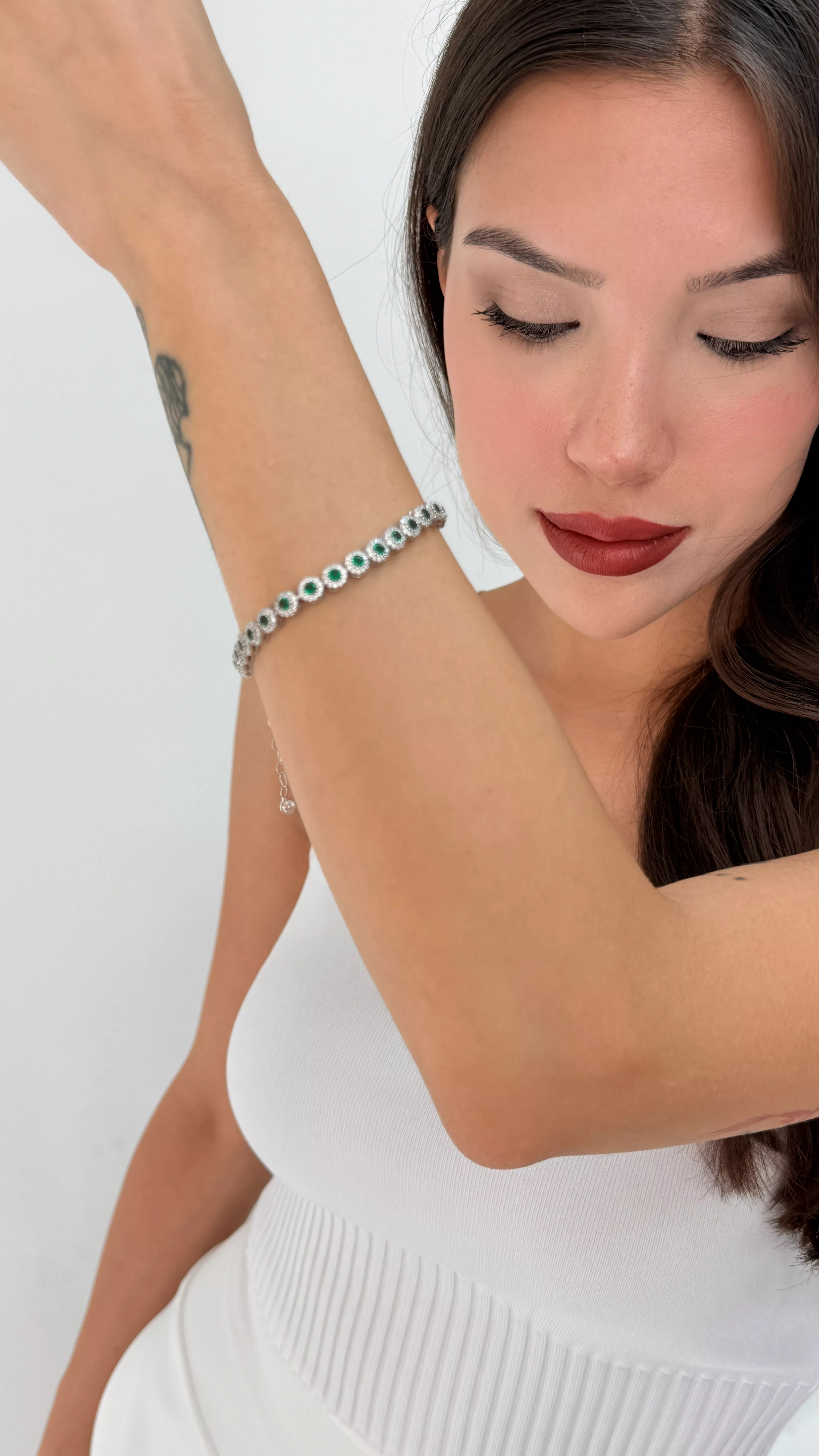 Doğanın tazeliğini ve huzurunu taşıyan bu zarif bileklik, 925 ayar gümüşten üretilmiş olup, göz alıcı yeşil taşlarla tasarlanmıştır. Oval kesimli taşlar, bilek boyunca su yolu formunda dizilerek hareketli bir ışıltı yaratır.