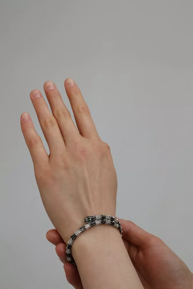 Zarafetin ve gizemin sembolü olan yılan motifi, bu özel tasarım bileklikte 925 ayar gümüşle hayat buluyor. İnce işçilikle şekillendirilmiş yılan figürü, doğal akışkanlığıyla bileğinizde adeta süzülüyor. Göz alıcı taş detayları ve siyah emaye dokunuşlarla zenginleştirilen tasarım, hem modern hem de mistik bir hava sunuyor.